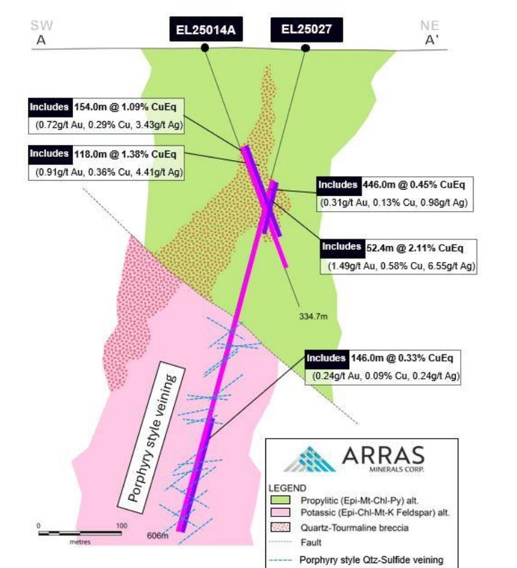 Arras Minerals (ARK.V) released the final drill results from its 2025 Elemes drill program in Kazakhstan a few weeks ago. The best result was a 52.4 meter interval carrying 2.11% copper-equivalent (consisting of 0.58% copper and 1.49 g/t gold) within a thicker interval of 446 meters containing 0.45% copper-equivalent (0.13% copper and 0.31 g/t gold) starting at a depth of 160 meters. The higher grade interval started at a depth of 168 meters. The hole was targeting the continuation of the porphyry mineralization towards the south.
