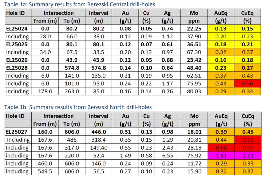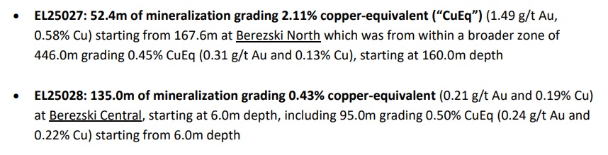 The final hole of the drill program, EL25028 was drilled at Berezski Central and encountered 135 meters of 0.43% copper-equivalent (0.19% copper and 0.21 g/t gold). This hole extended the mineralization at Berezski Central a further 200 meters to the northwest, and the Central target now measures 750 meters by 500 meters as other holes drilled at Central also encountered mineralization (but at a lower grade than the headline results).