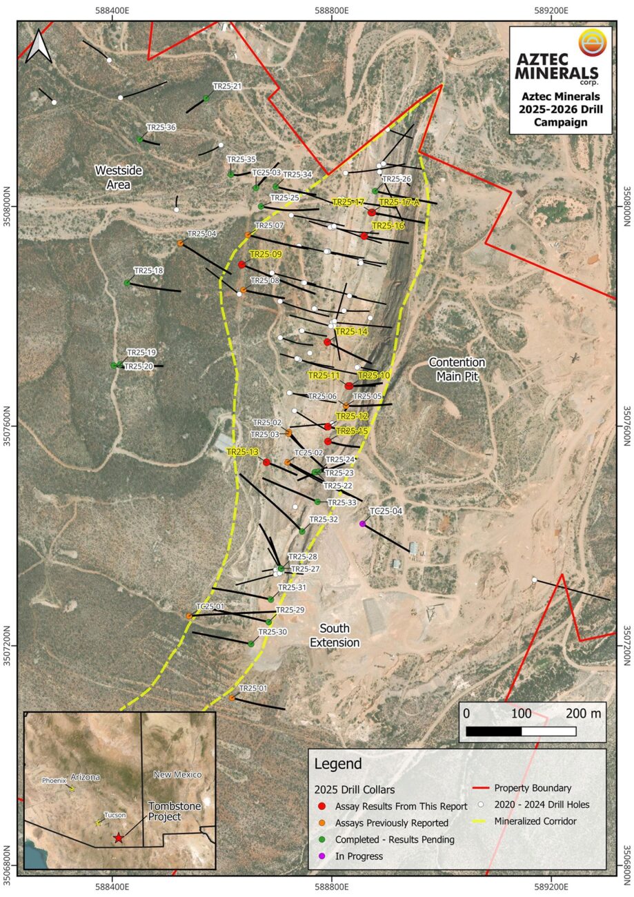 Aztec Minerals (AZT.V) has released the assay results from an additional seven RC holes completed on its Tombstone gold-silver project in Arizona. Additionally, the company released the multi-acid digestion analytical results, providing more data compared to the fire assay results on holes 16, 17 and 17A that were released in November 2025. As you can see below, hole 17 intersected 57.8 meters of 5.16 g/t gold and 39.12 g/t silver for a total silver-equivalent grade of 400. This interval was boosted by a very high-grade zone where the drill bit intersected 4.6 meters of 58.5 g/t gold and 173 g/t silver for a total silver-equivalent grade of in excess of 4,200 g/t.