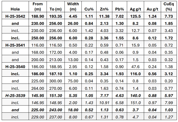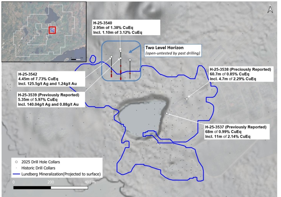 Canterra Minerals (CTM.V) has released the assay results from three holes focusing on stepping out 50 meters at a time from hole H-25-3539, which intersected 5.35 meters of 5.97% copper-equivalent (the results of that hole were published in May). The table below shows the assay results from holes 3540-3542 with the holes being 50 meter step outs towards respectively the north, east and west of hole 3539.