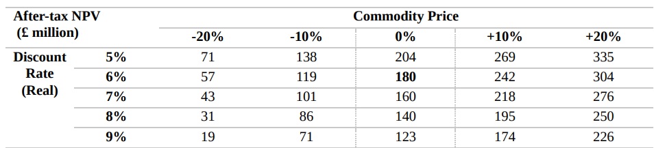 The sensitivity analysis shown above provides a good overview of how the after-tax NPV varies depending on the discount rate and used commodity price. It is clear why Cornish Metals didn’t want to use the 8% discount rate (the standard discount rate for non precious metals projects), as that would result in a 40M GBP lower NPV. The sensitivity table also shows the leverage South Crofty offers on the tin price. Applying a price of just over $37,000/t would add 55M GBP in after-tax NPV8%, but this of course works both ways. A 10% lower tin price of just over $30,000/t removes 54M GBP from the NPV8%.