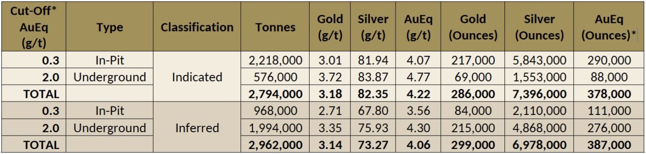 Independence Gold (IGO.V) has announced an upgraded resource calculation on its flagship 3Ts project in British Columbia. The resource now contains just under 300,000 ounces of gold in the indicated category and an additional 299,000 ounces of gold in the inferred resource category. As the table below shows, about half of the ounces are open pittable with the remaining half classified as an underground resource.
