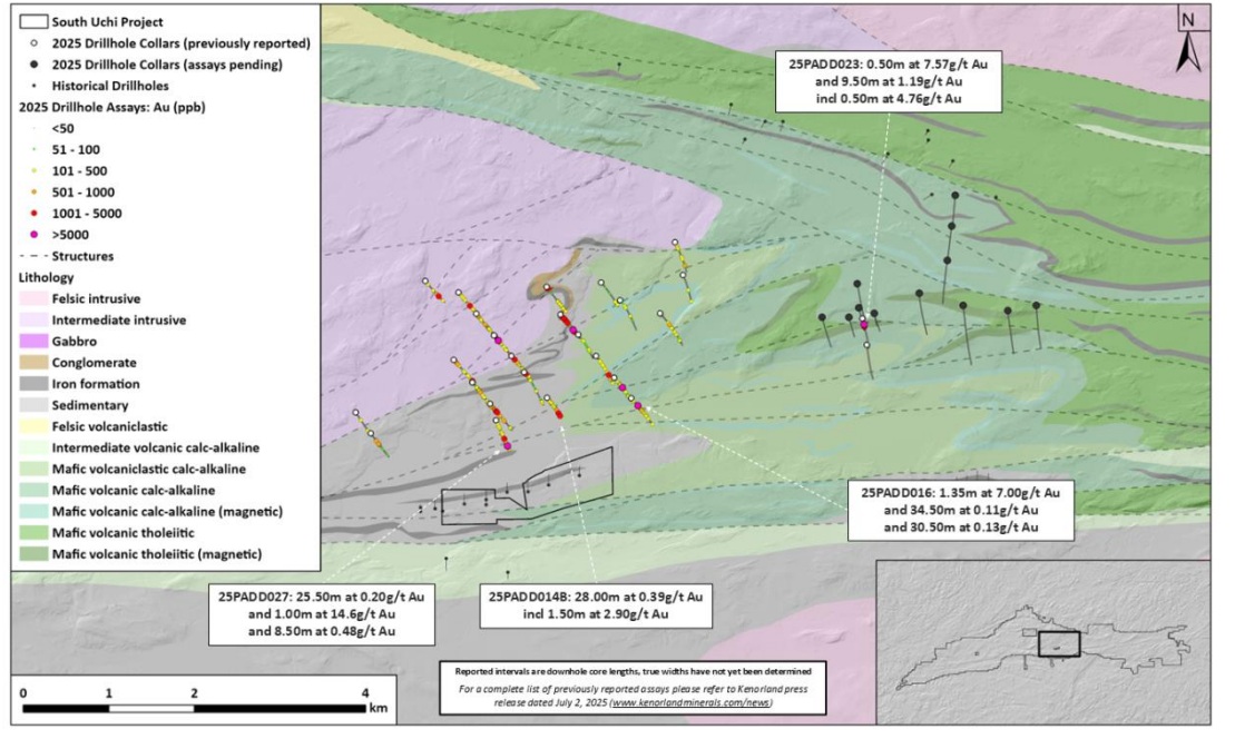 Kenorland Minerals (KLD.V) has announced joint venture partner Auranova has completed the phase 2 drill program at South Uchi, which was designed to follow up on the results of the 2025 winter drill campaign. That winter drill program confirmed the presence of a five kilometer long structural corridor. The most recent drill program consisted of 13 holes for a total of just under 7,100 meters of diamond drilling.