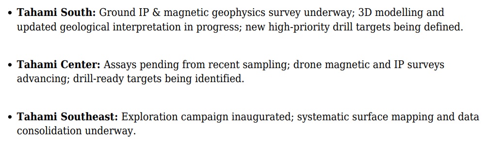 Although the company has been successful in encountering the mineralized zone that Aris Mining is mining across the property boundary, we are very interested in seeing the more details on the copper porphyry target at Tahami Center. Past exploration programs have outlined a 2000 by 1400 meter mineralized footprint at surface with copper, molybdenum and gold as primary metals.