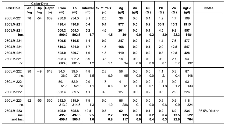 Hole 222 (drilled close to the claim boundary) was somewhat more disappointing with lower grade results and even the deeper interval of 0.8 meters true width of 226 g/t silver-equivalent (with approximately 55% of that equivalent grade being actual silver) isn’t very exciting. But hole 223 was pretty good again with a true thickness interval of 9.3 meters containing 234 g/t silver-equivalent, but including 2.2 meters (still on a true width basis) of 522 g/t silver-equivalent directly followed by 0.9 meters of 764 g/t silver-equivalent.