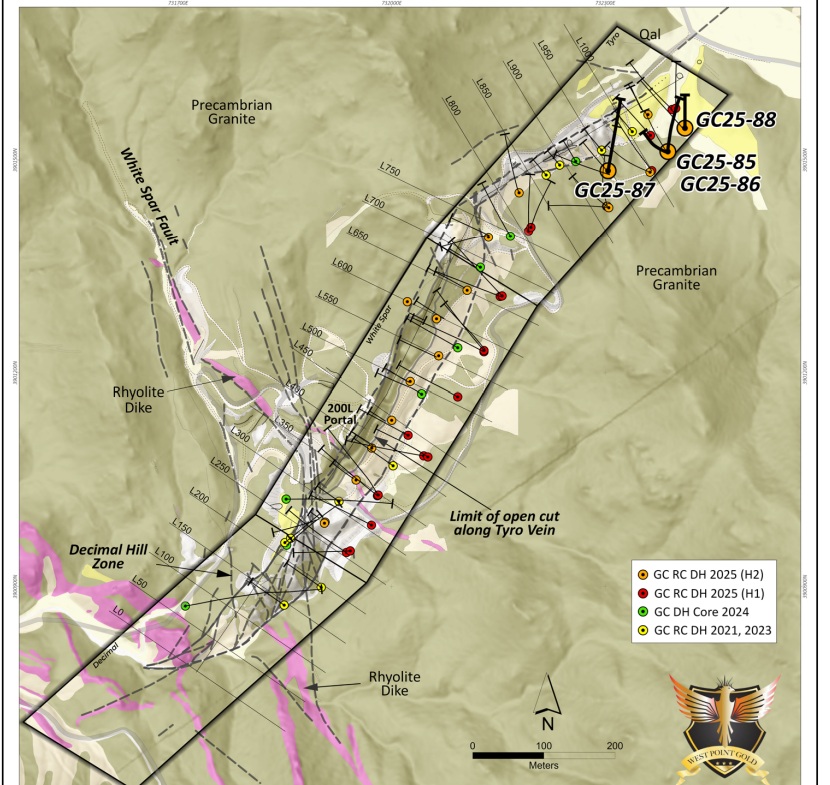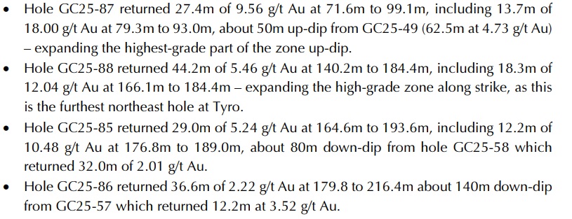 West Point Gold (WPG.V) has released the assay results from an additional four holes that were drilled on the Tyro zone. All four holes encountered high-grade mineralization (we even count the 2.22 g/t in hole GC25-86 as high-grade as that will likely be more than 10 times higher than the cutoff grade in an oxide-hosted gold project). The bullet points below show the highlights of the four holes, and it’s quite clear the 27.4 meters of 9.56 g/t in hole GC25-87, starting at just under 72 meters down hole, is excellent. But all holes are exceeding our expectation as it looks like the company continues to intersect underground grades in a potential open pit configuration (to be confirmed when the maiden resource calculation will be published). In any case, CEO Derek Macpherson’s comment highlights the continuity of the mineralization, as the high-grade zone at NE Tyro appears to continue at depth and towards the northeast.