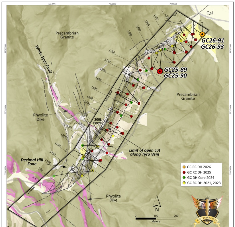 The company has now completed approximately 10,000 meters of its 15,000 meter drill program, and we expect assay results to continue to trickle in over the next few months. Core drilling at Northeast and Main Tyro is expected to start any day now, while the company also expects to receive its Plan of Operations in the near future which will allow West Point to follow the vein towards the Frisco Graben. The Plan of Operations will allow West Point Gold to drill holes outside the controlled patented claims, and this will be helpful to improve the efficiency of drilling going forward.