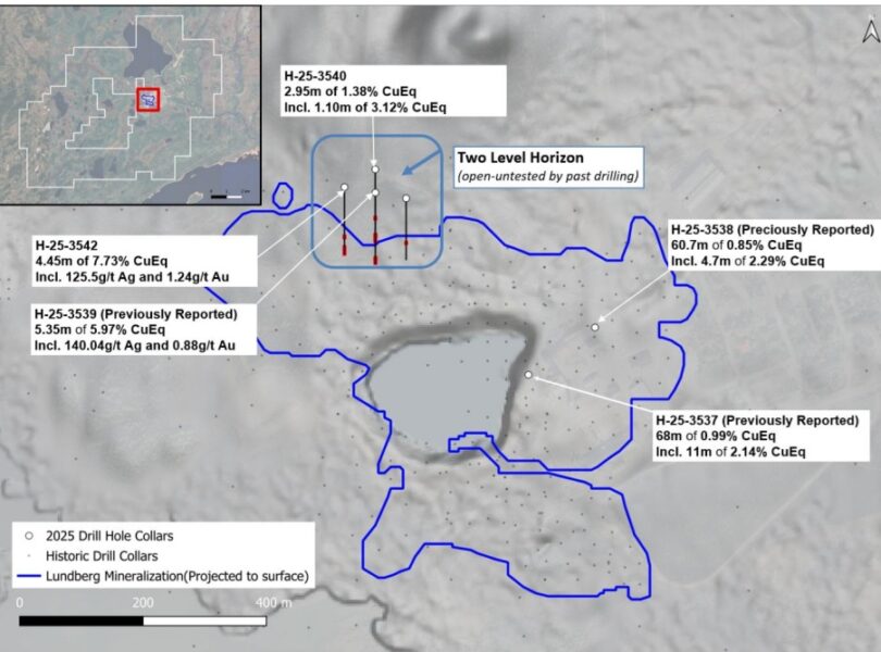 Canterra Minerals (CTM.V) has released the assay results from three holes focusing on stepping out 50 meters at a time from hole H-25-3539, which intersected 5.35 meters of 5.97% copper-equivalent […]