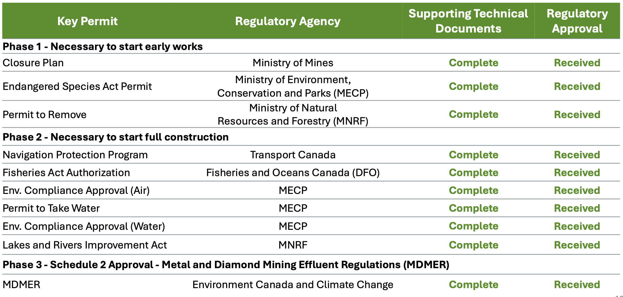 As you can see below, the relevant authorities have issued all the major permits that were required before kicking off the construction phase of the Marathon project, so there definitely is sufficient political willingness and support to convert the project into a mine.