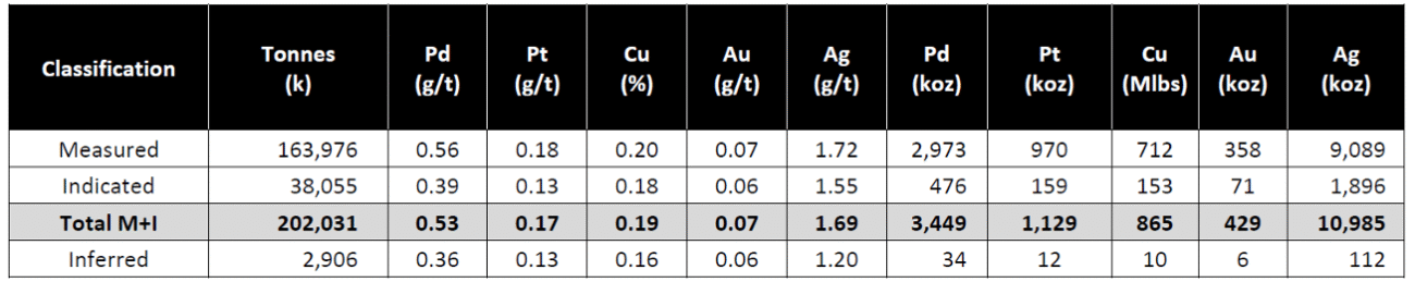 This means the project hosts almost 3.5 million ounces of palladium, 1.1 million ounces of platinum and just under 900 million pounds of copper as well as a respectable amount of gold and some silver.