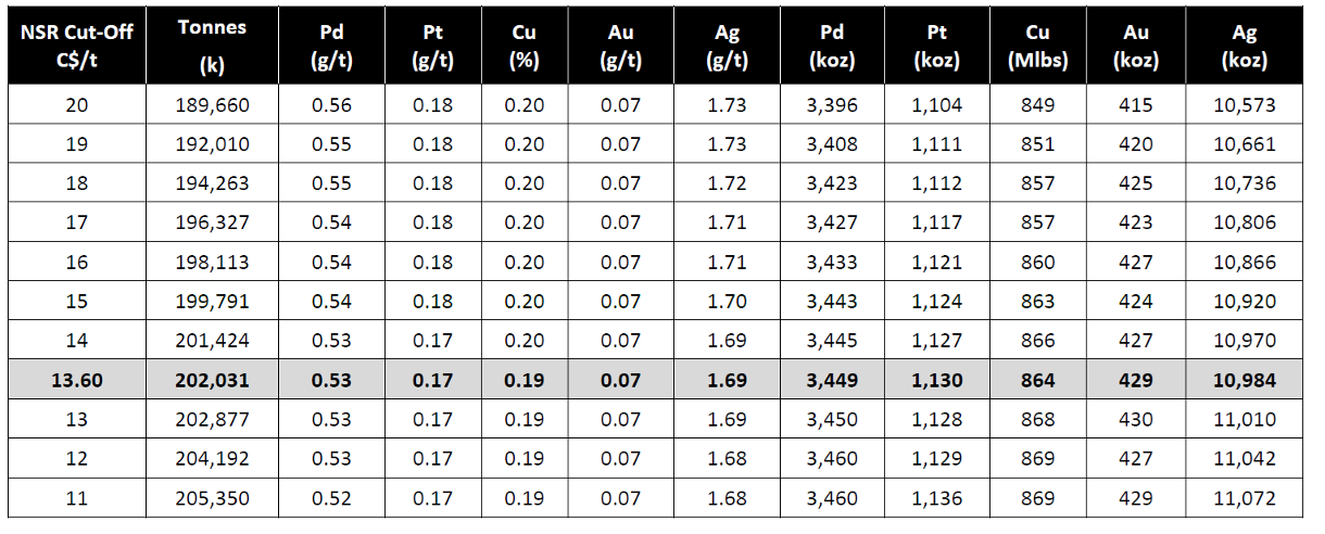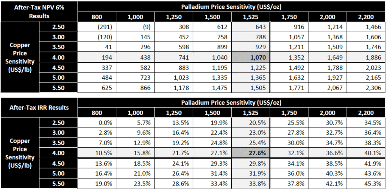The image below shows the nicely detailed sensitivity analysis which indicates the impact of a changing palladium and copper price on the economics of the project.