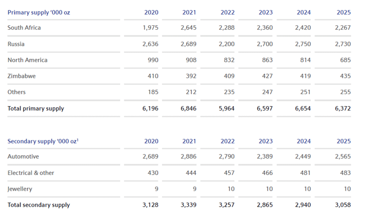 The total primary supply is estimated at approximately 6.4 million ounces this year, while an additional 3.06 million ounces of palladium is expected to be recovered from the secondary supply, for a total supply of 9.43 million ounces.