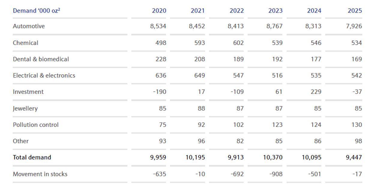 As shown in the table below, the total demand is expected to come in around 9.5 million ounces, mainly due to a decrease in the demand from the automotive sector while the demand from the industrial sector should remain pretty stable. It is also interesting to see an expected net contribution of 37 million ounces from investments in palladium, and that’s a delta of 266,000 ounces compared to 2024.