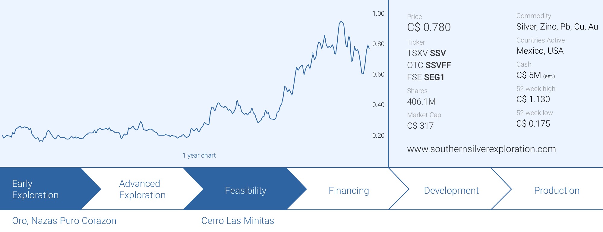 Southern Silver Exploration (SSV.V) has now reported on fourteen of the 22 holes it has drilled on the Puro Corazon claim, in the middle of the flagship Cerro Las Minitas silver-zinc project in Mexico. The drill results have surpassed our expectations as the grade came in higher than we had anticipated, which strengthens the view that Puro Corazon could be an important piece of the puzzle to develop Cerro Las Minitas.