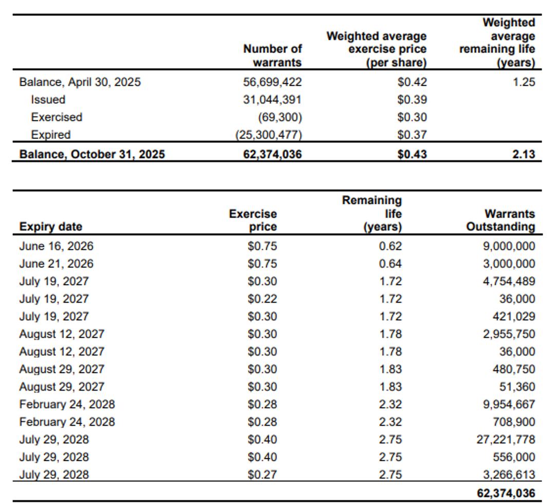 At the end of October, the company had 62.4M warrants outstanding at an average exercise price of C$0.43. As per the footnotes to the Q2 financial statement, approximately 3.5M warrants were exercised in November and December for total proceeds of C$1.1M. This leaves about 47M warrants outstanding and in the money (the 12M warrants with an exercise price of C$0.75 are currently out of the money).