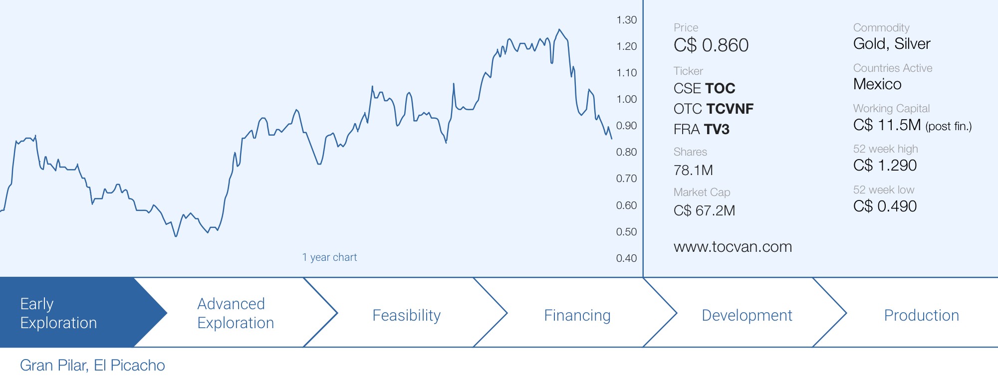 Tocvan has never been as well-capitalized as it is now, with almost C$12M in working capital. This means the drill programs on both Gran Pilar and El Picacho are fully funded, while the anticipated low single digit construction cost for the heap leach pilot facility will be covered as well.